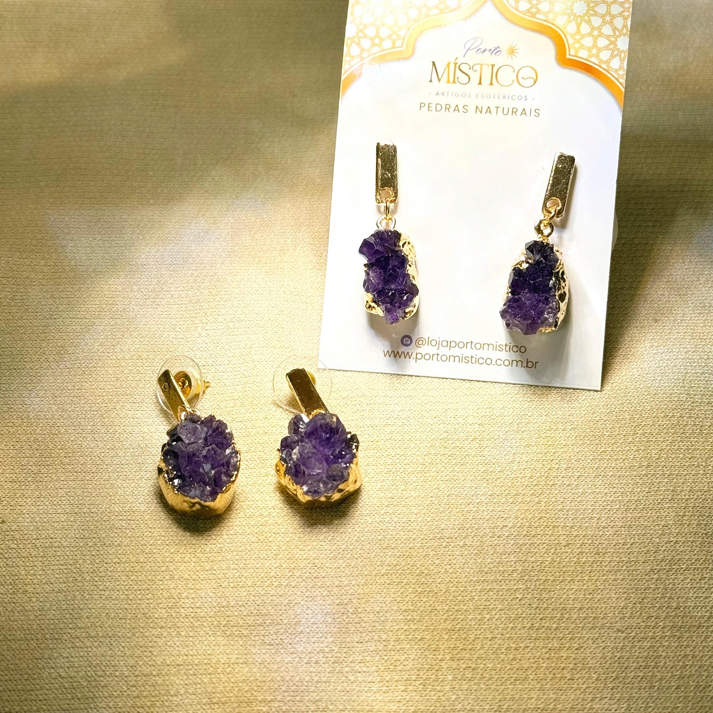 Brinco com Ametista Bruta Natural, cuidadosamente selecionada e montada em base folheada de alta qualidade. A Ametista é considerada uma das pedras mais espirituais, associada à intuição, proteção energética, clareza mental e equilíbrio emocional.