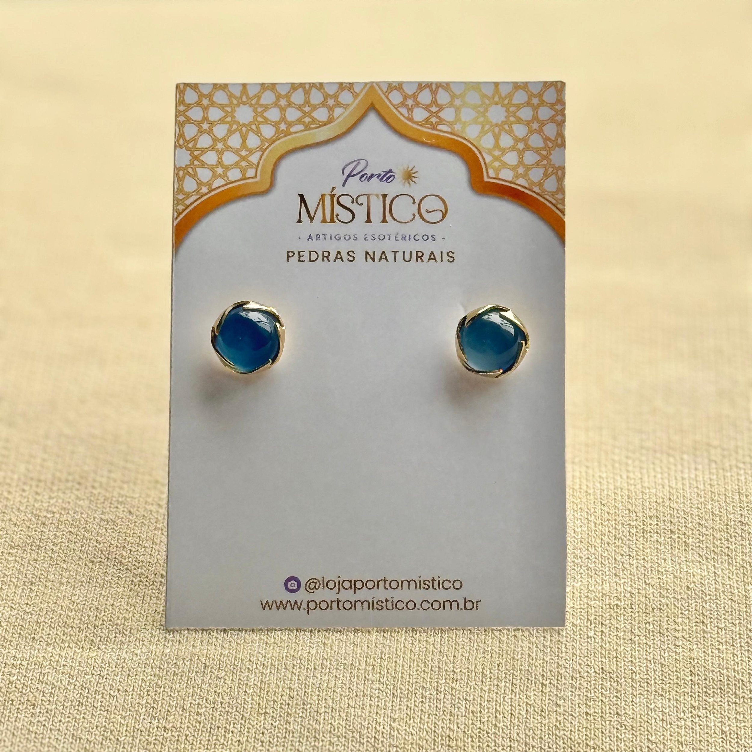 Brinco meia esfera com pedra natural Água-Marinha. Traz serenidade, leveza emocional e favorece a clareza na comunicação. Ideal para momentos de paz e equilíbrio.