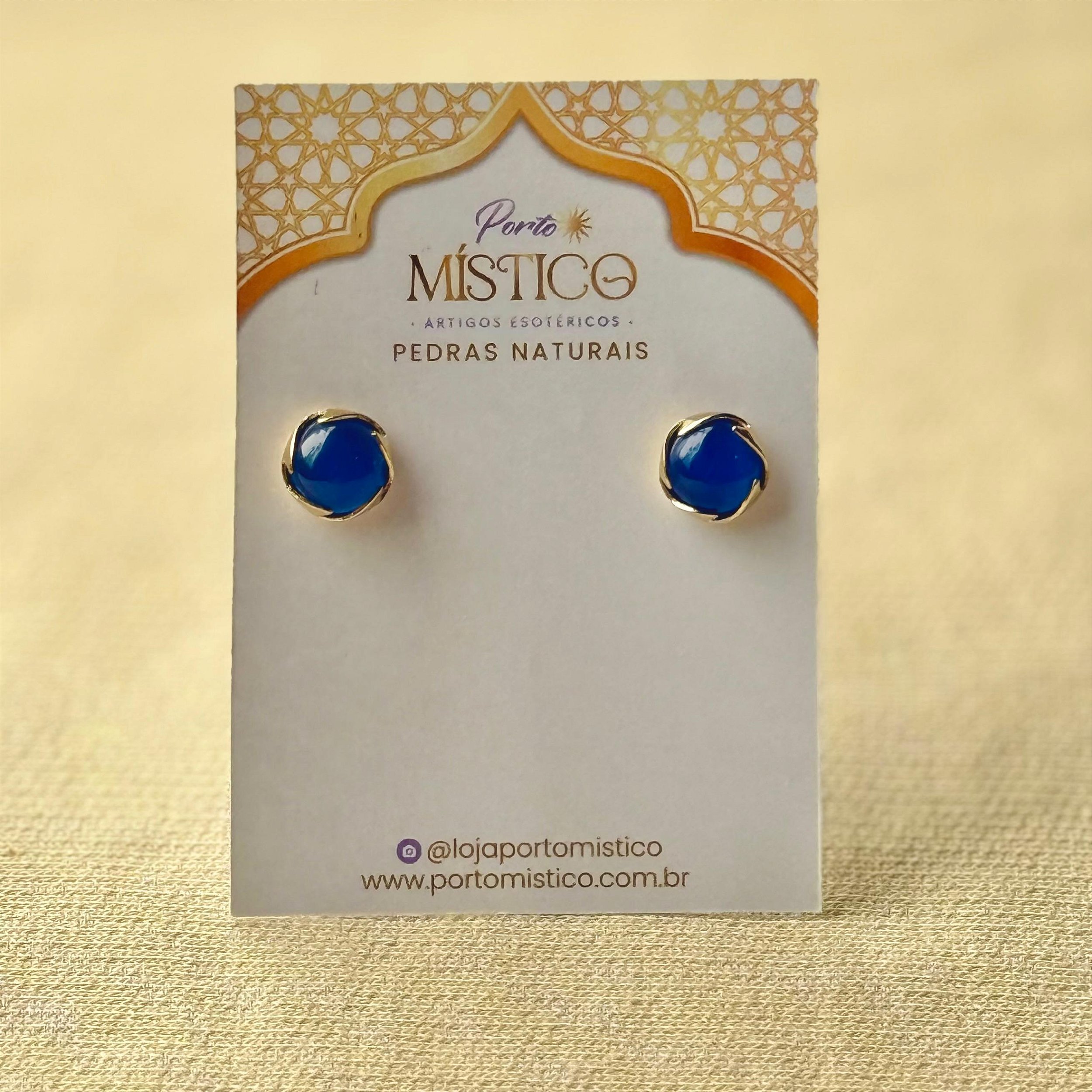 Brinco meia esfera com pedra natural Sodalita. Estimula a mente racional, fortalece a autoestima e favorece o equilíbrio entre emoção e razão.