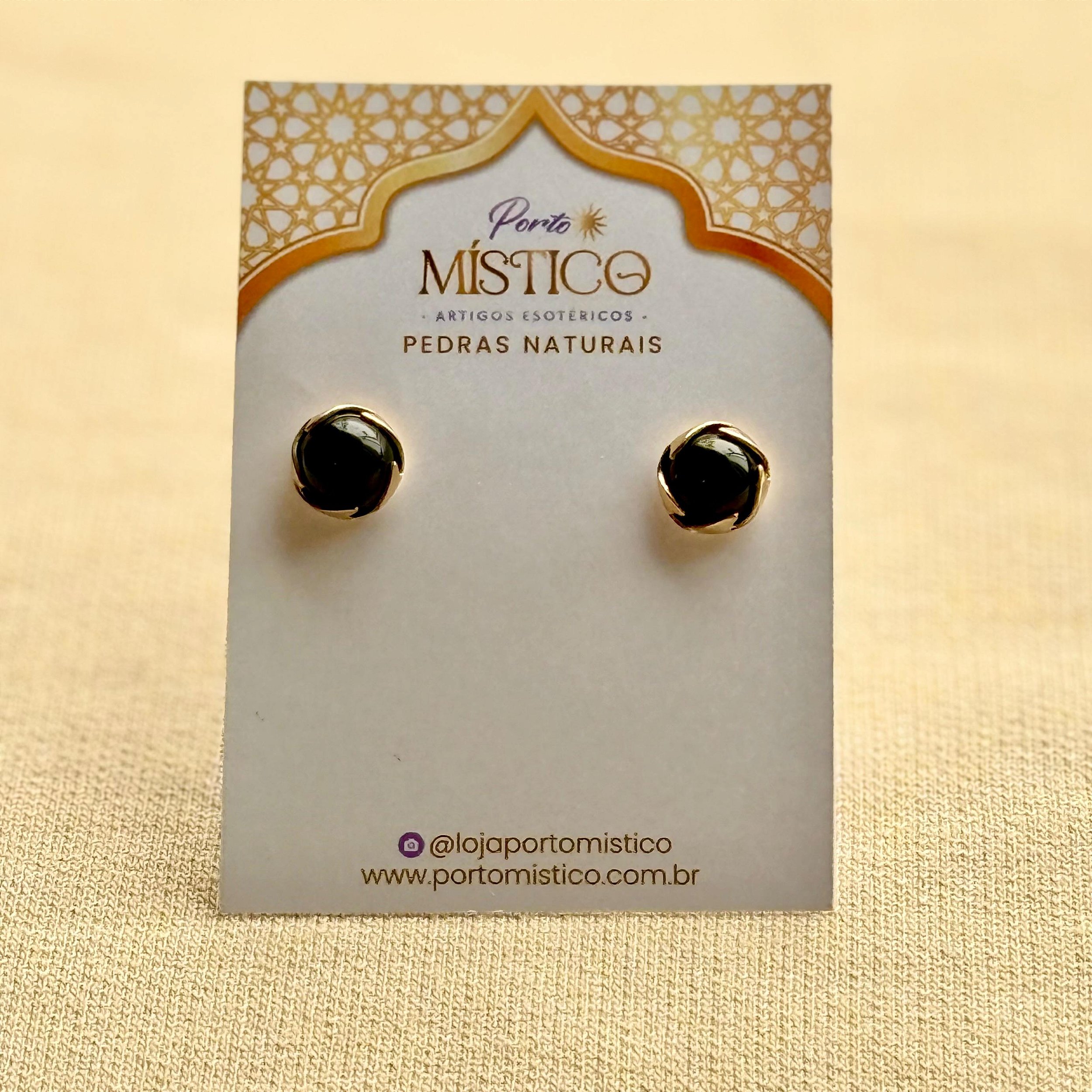 Brinco meia esfera com pedra natural Turmalina Negra. Um verdadeiro escudo energético contra inveja e negatividade, para manter sua vibração protegida no dia a dia.