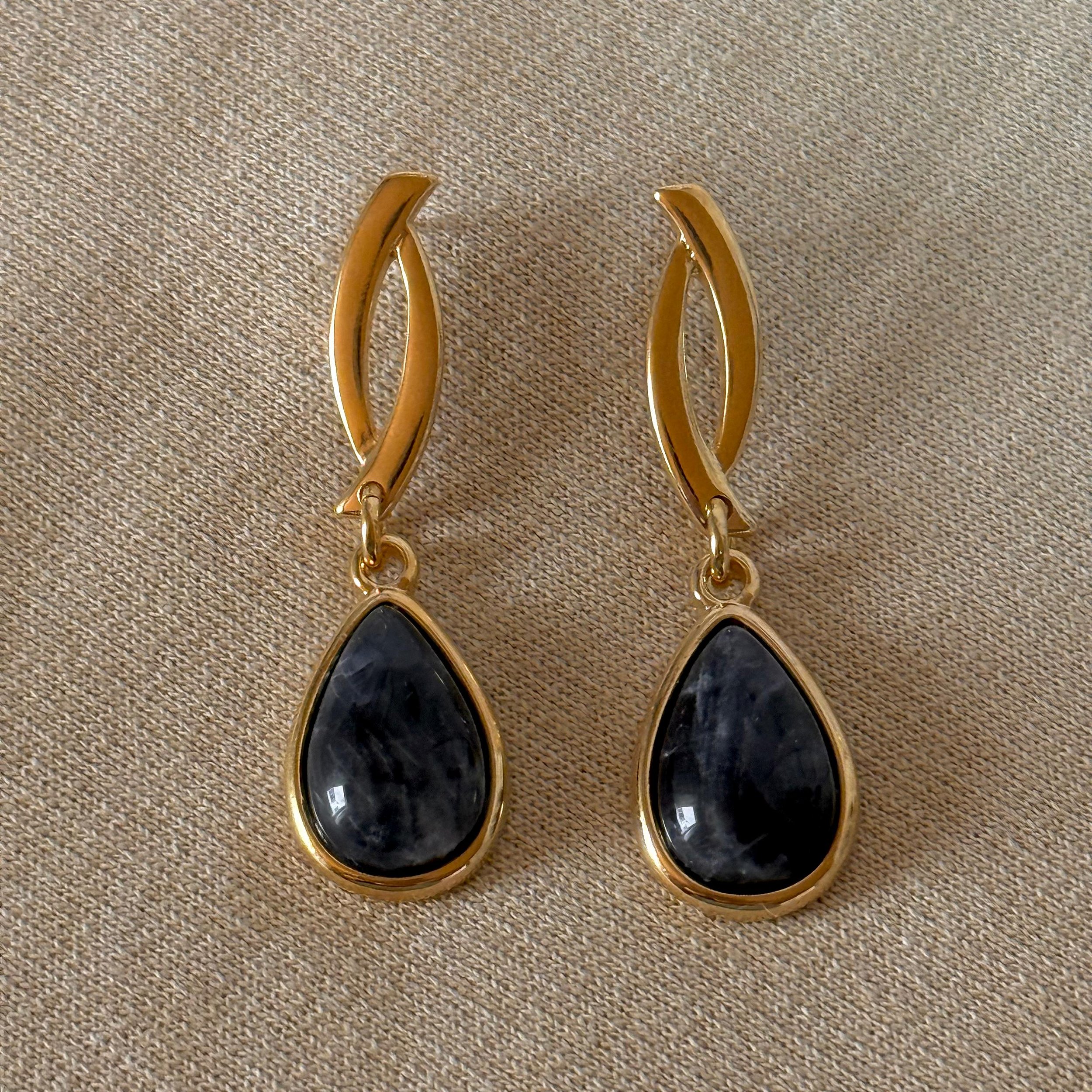 Brinco semijoia com pedra natural de Ônix Rajado Branco, em formato de gota, com veios únicos que tornam cada peça exclusiva.