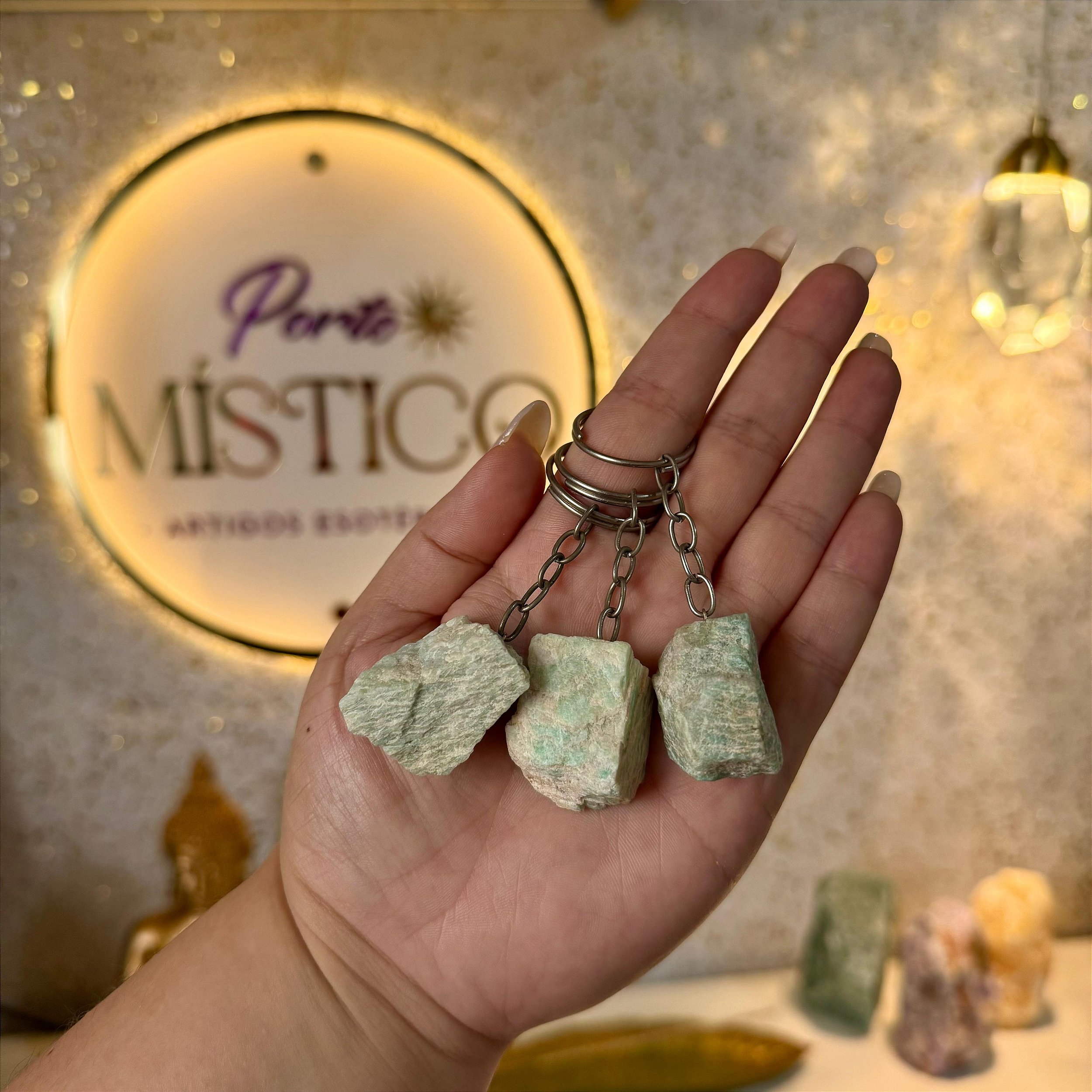 A Amazonita traz clareza, suavidade e força interior. Este chaveiro com pedra bruta ajuda na comunicação clara, no alívio de estresse e no fortalecimento do eu verdadeiro.
