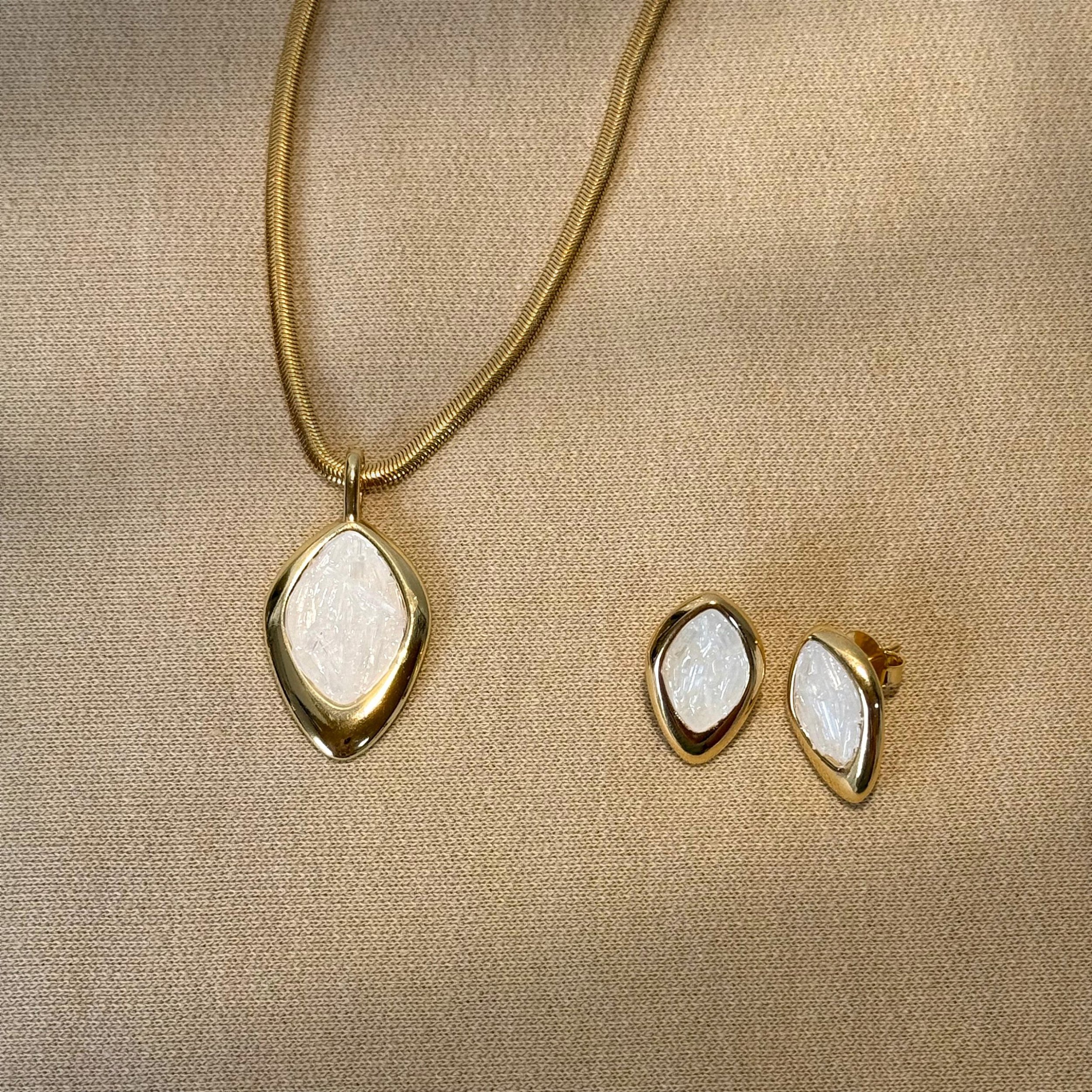 Envolva-se na energia pura e celestial deste conjunto de semijoia, com colar e brincos banhados a ouro 18k e pedras naturais de Selenita. Conhecida por sua vibração elevada e conexão espiritual, a Selenita transmite leveza, limpeza energética e serenidade em cada detalhe.