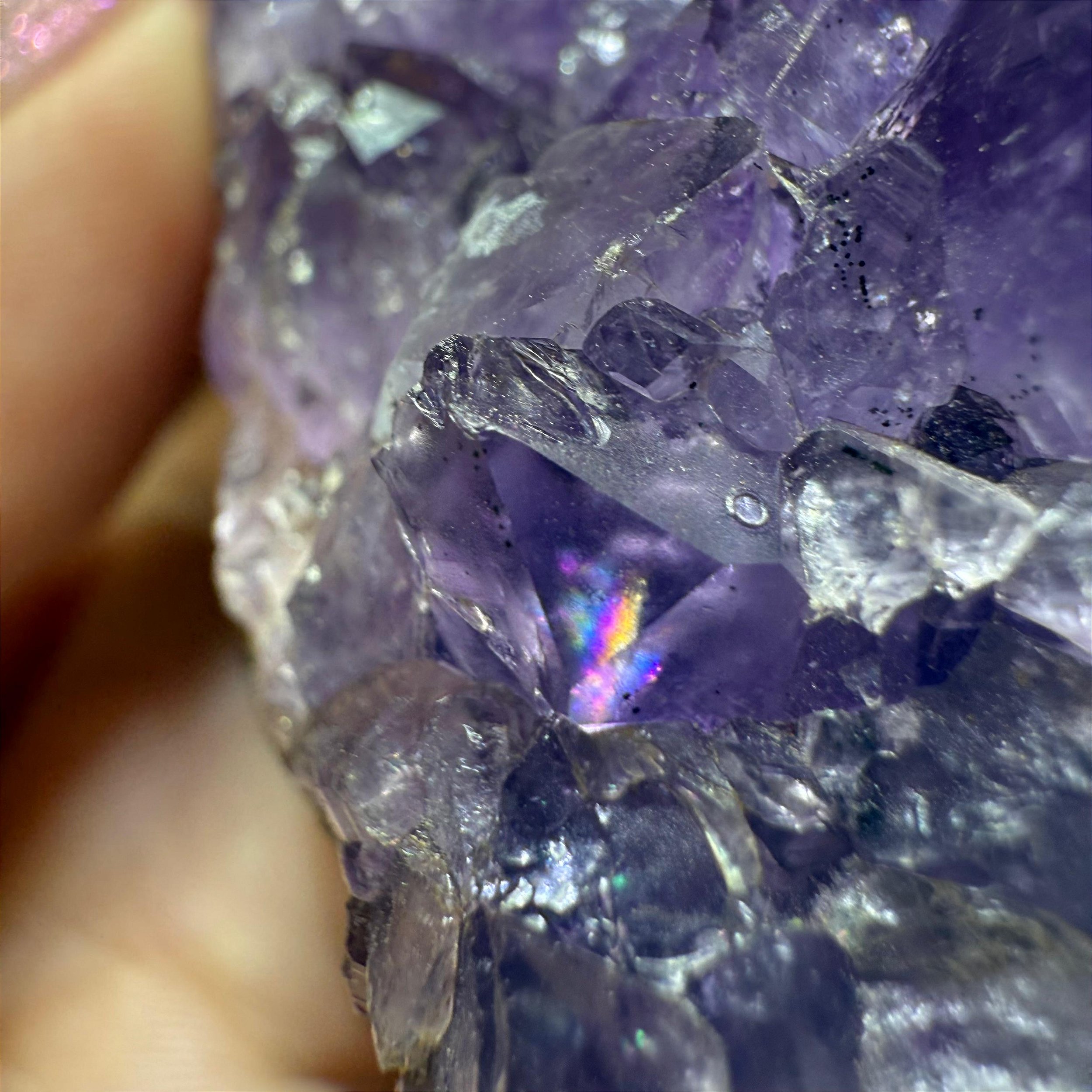 Essa combinação de cor intensa, formação cristalina perfeita e presença rara de arco-íris torna essas ametistas peças de alto padrão, dignas de coleção ou de destaque em qualquer altar, decoração ou trabalho energético.