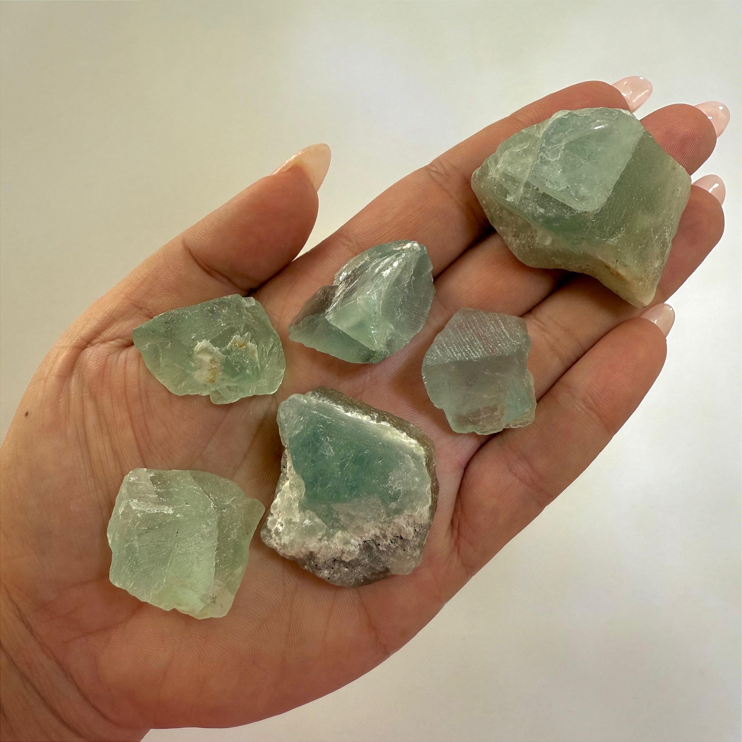 Pedra natural de Fluorita bruta, com variações únicas de tons entre verde, roxo e transparente. Tamanho médio entre 3cm e 6cm.