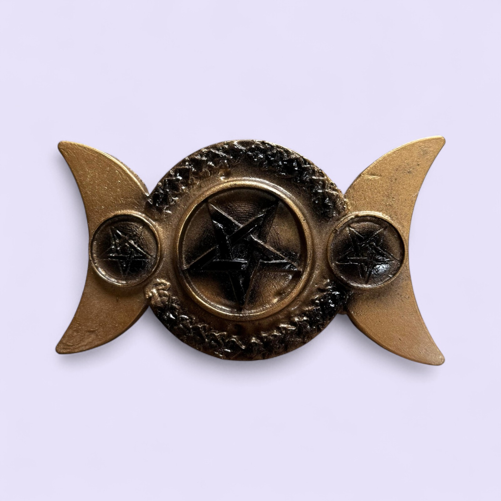 O Incensário Triluna em resina na combinação dourado com preto é uma peça mística e elegante, ideal para rituais, meditações e altares. Carrega o símbolo da Deusa Tripla (Donzela, Mãe e Anciã), representando os ciclos da vida e a conexão com o Sagrado Feminino.
