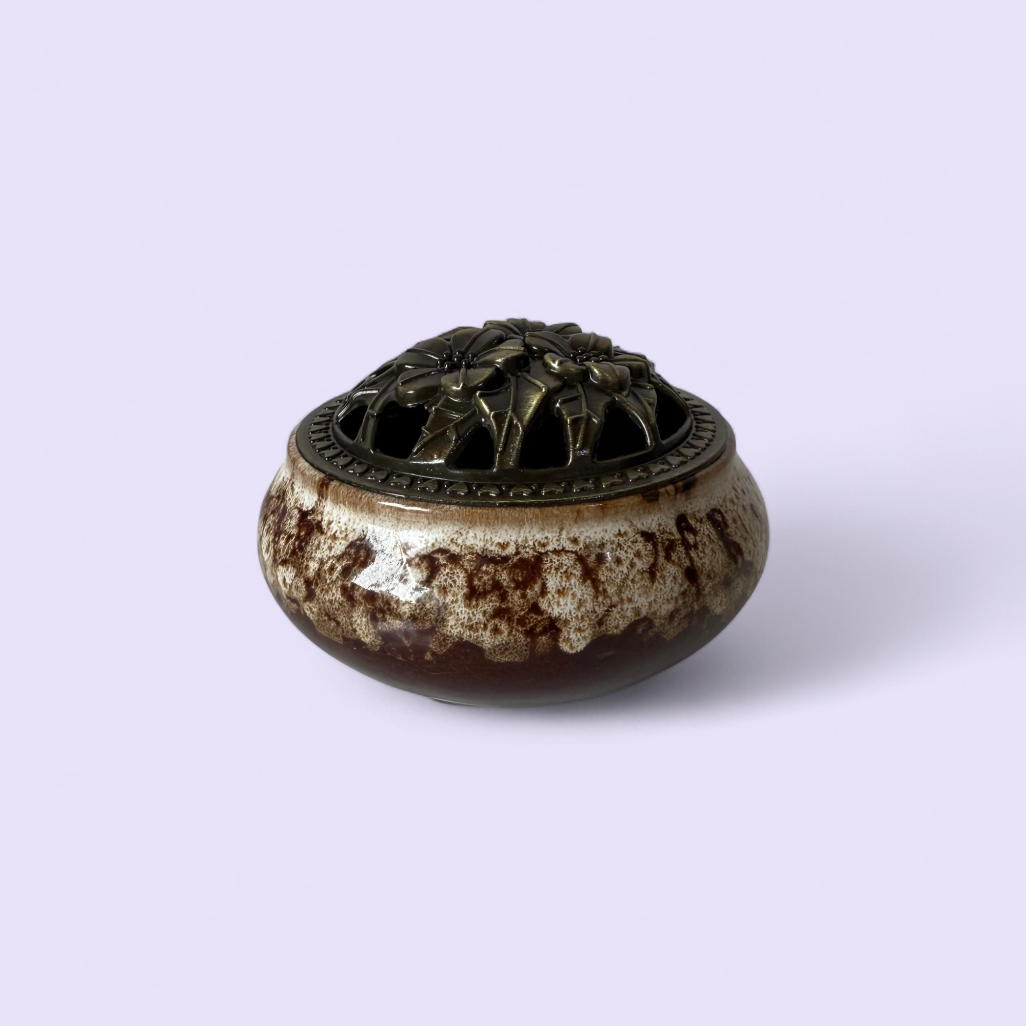 Este refinado incensário turíbulo em porcelana, nas cores bege e marrom, apresenta uma tampa com desenho arabesco floral que permite a saída delicada da fumaça. Queime incensos, ervas ou resinas, enquanto a fumaça cria um efeito visual elegante e perfuma suavemente o ambiente.