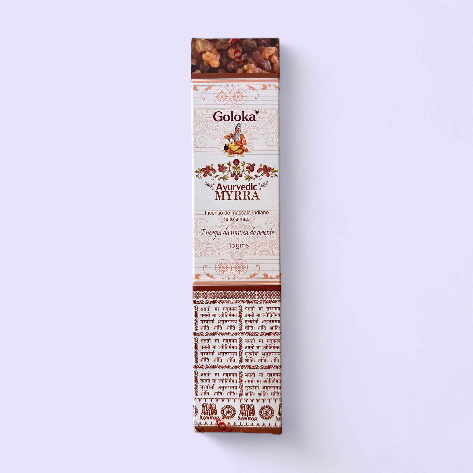 Tradicional e sagrado, o incenso de mirra da Goloka conecta você à mística do Oriente. Seu aroma profundo ativa a proteção espiritual, o recolhimento e a conexão com o divino.