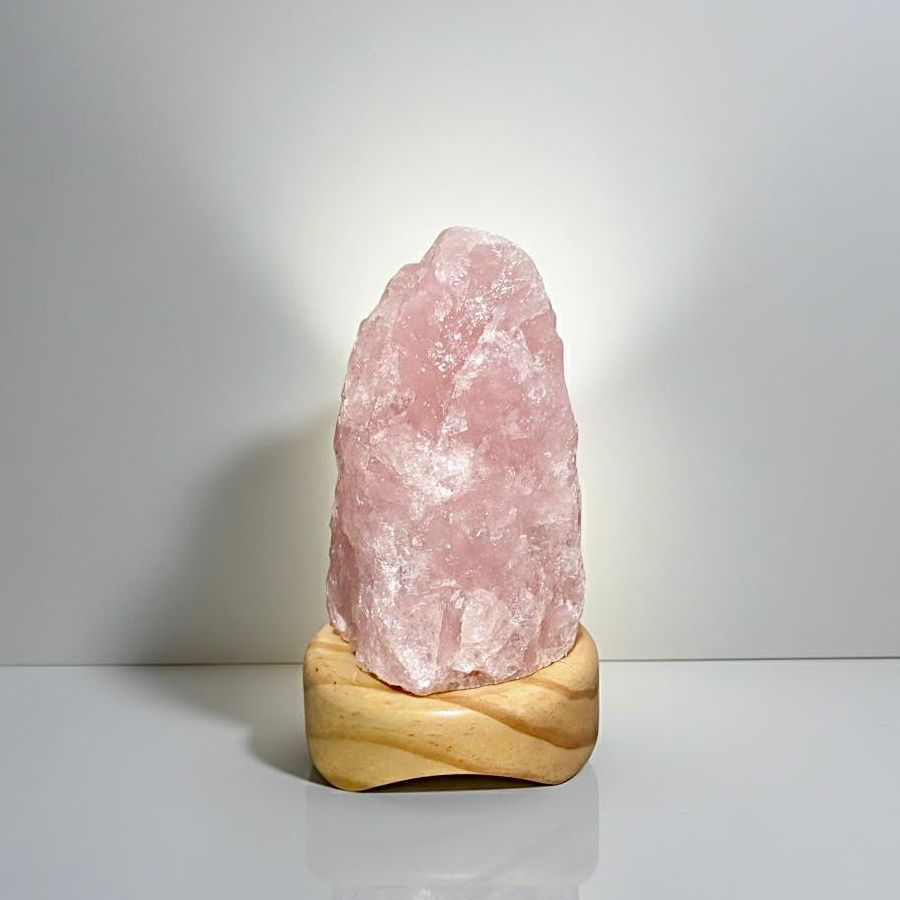 Luminária artesanal com cristal bruto de Quartzo Rosa, medindo em média 13 cm de altura e pesando entre 800 g e 1.200 g. O cristal é fixado em uma base de madeira natural, unindo a beleza rústica da pedra com suas poderosas propriedades energéticas.