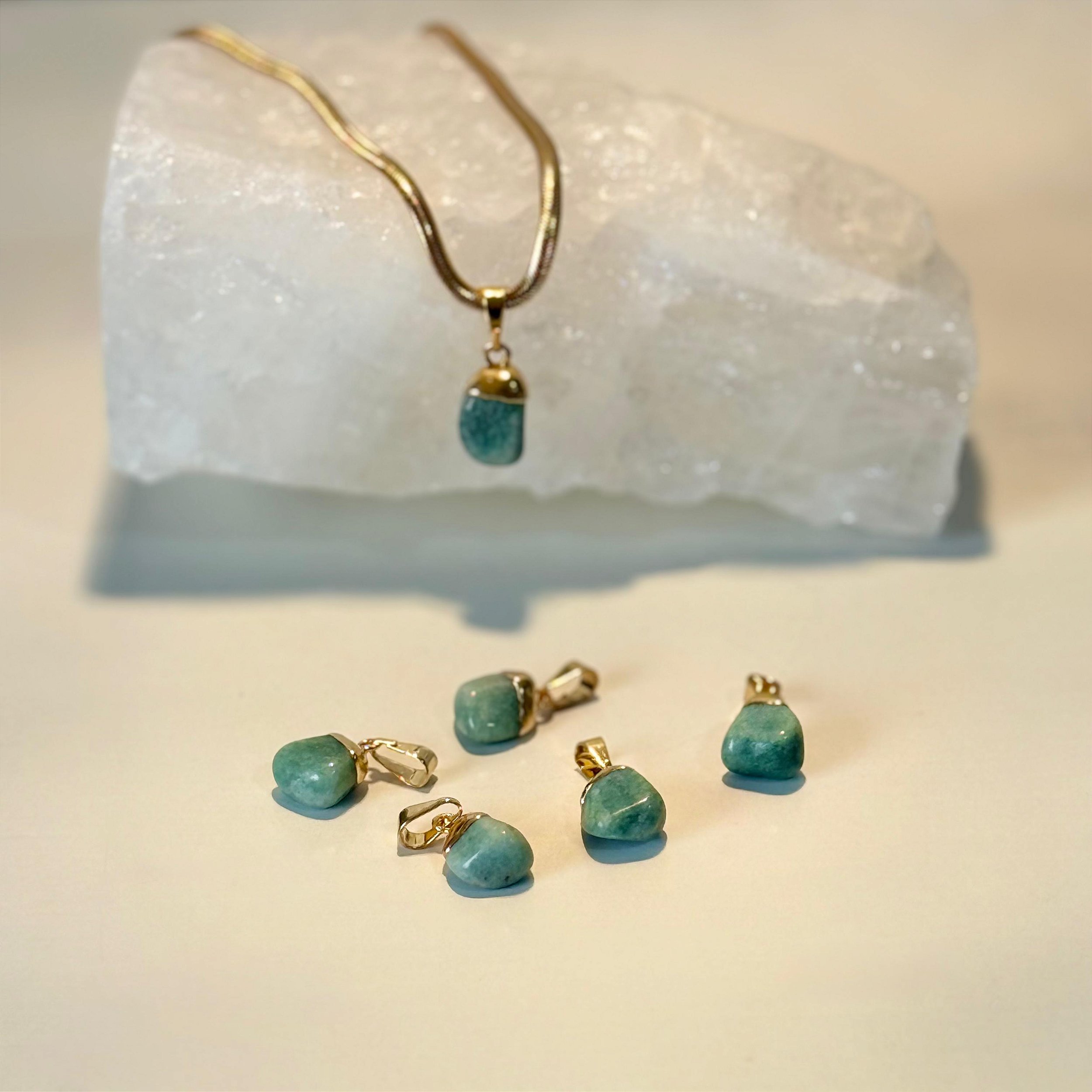A Amazonita é uma pedra calmante, que favorece a leveza nas emoções e o equilíbrio entre razão e coração. Este pingente com pedra rolada, folheado a Ouro 18K, promove comunicação gentil, alívio de tensões e harmonia emocional. Um amuleto de empatia e expressão verdadeira.