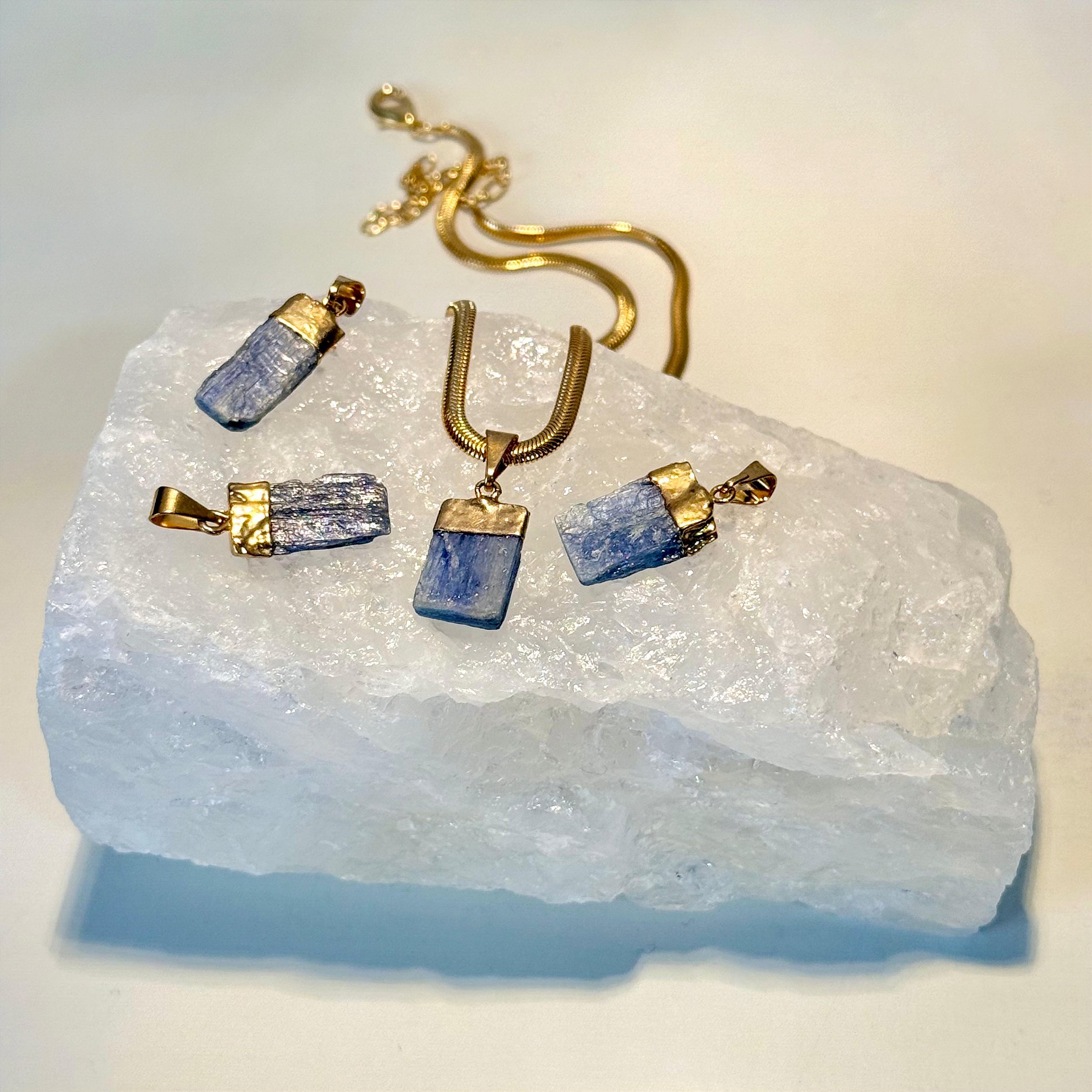 A Cianita Azul é altamente espiritual, reconhecida por sua capacidade de trazer clareza mental e harmonizar energias. Este pingente bruto, folheado a Ouro 18K, facilita a meditação, a canalização intuitiva e o equilíbrio emocional profundo. Uma pedra para quem busca silêncio interno e orientação espiritual.