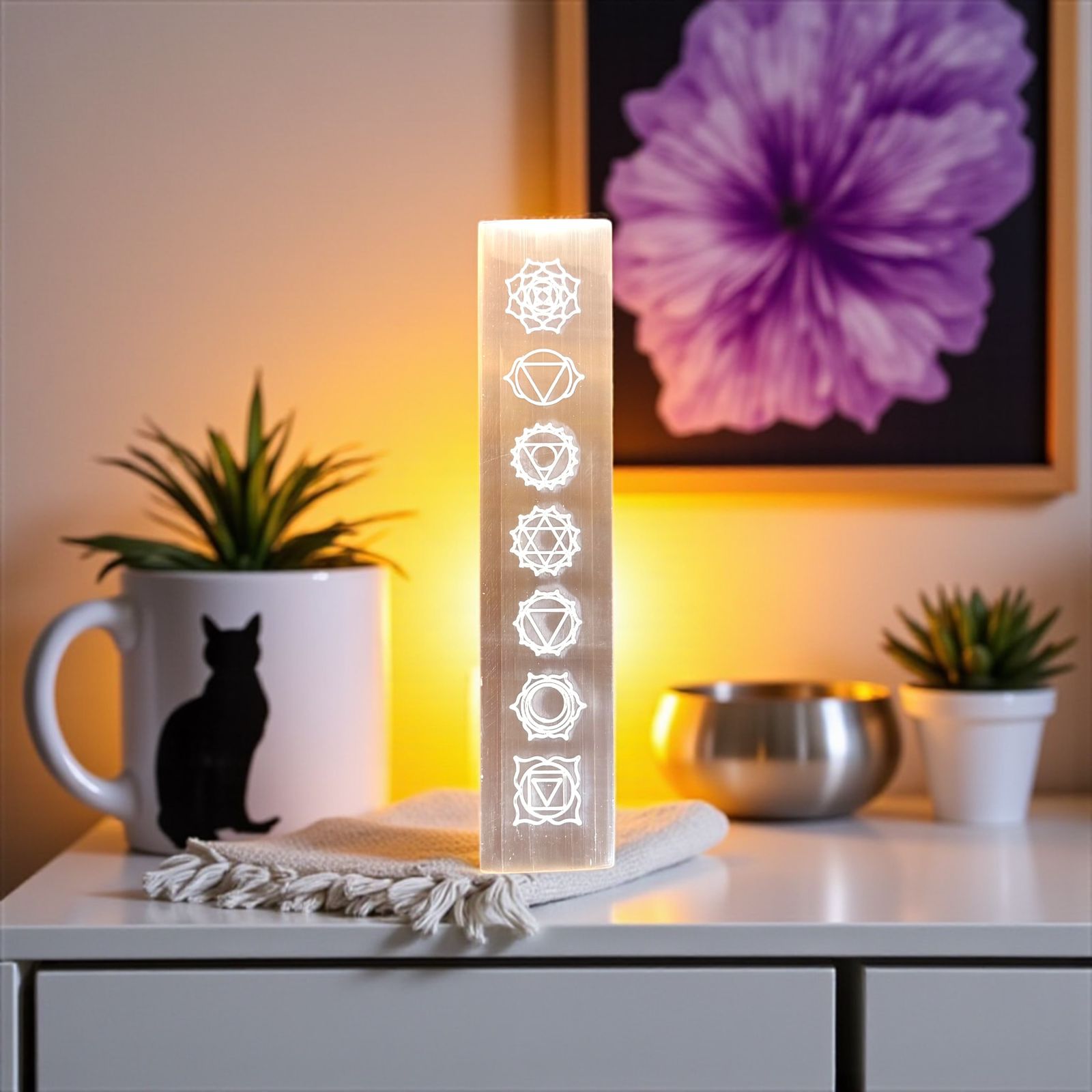 A Placa de Selenita com os 7 Chakras é uma peça artesanal que combina beleza e funcionalidade energética, ideal para quem busca equilíbrio espiritual, limpeza energética e proteção do ambiente.
