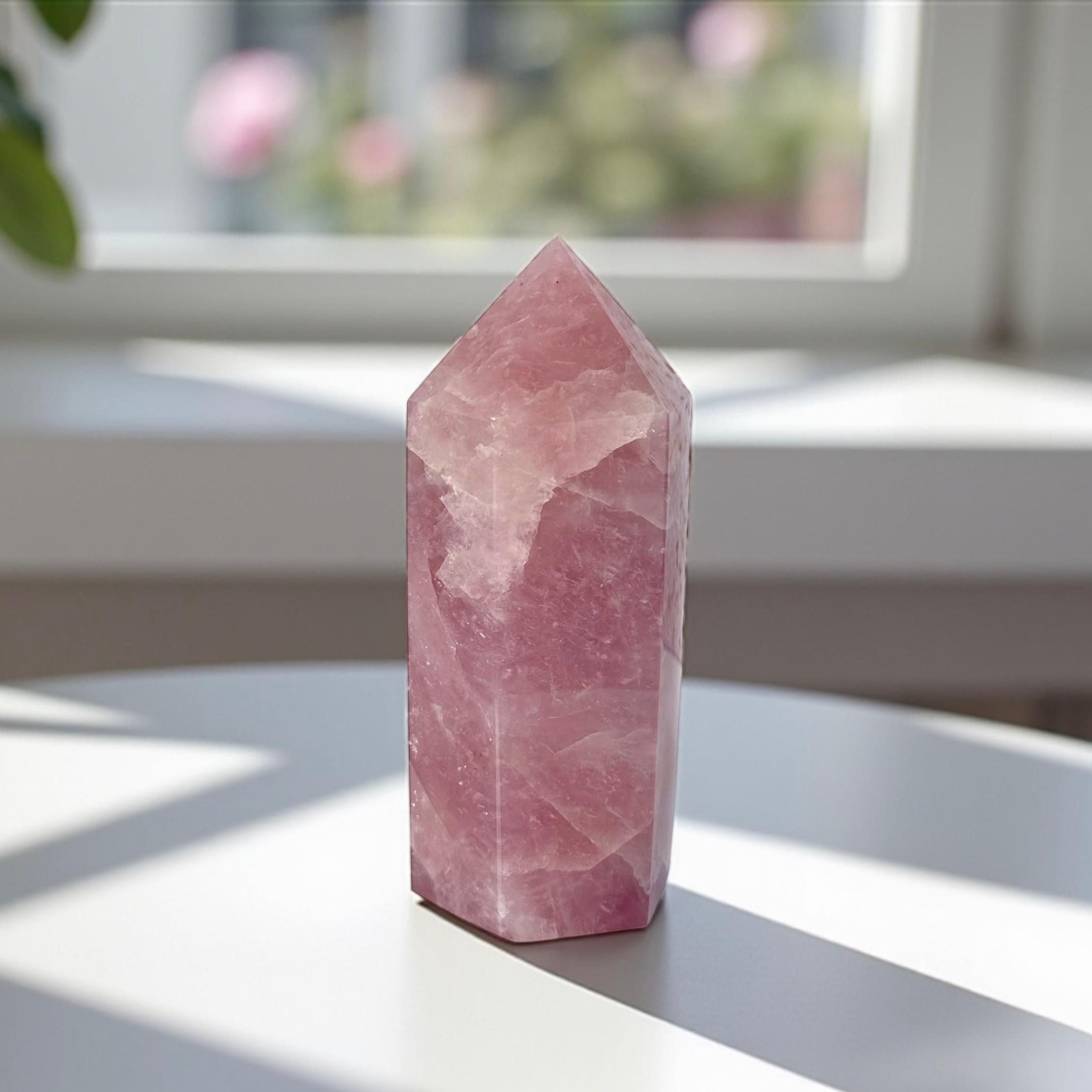 Um cristal elegante e poderoso que une delicadeza, força vibracional e sofisticação — perfeito para altares, práticas espirituais ou como um elemento decorativo de pura energia amorosa.