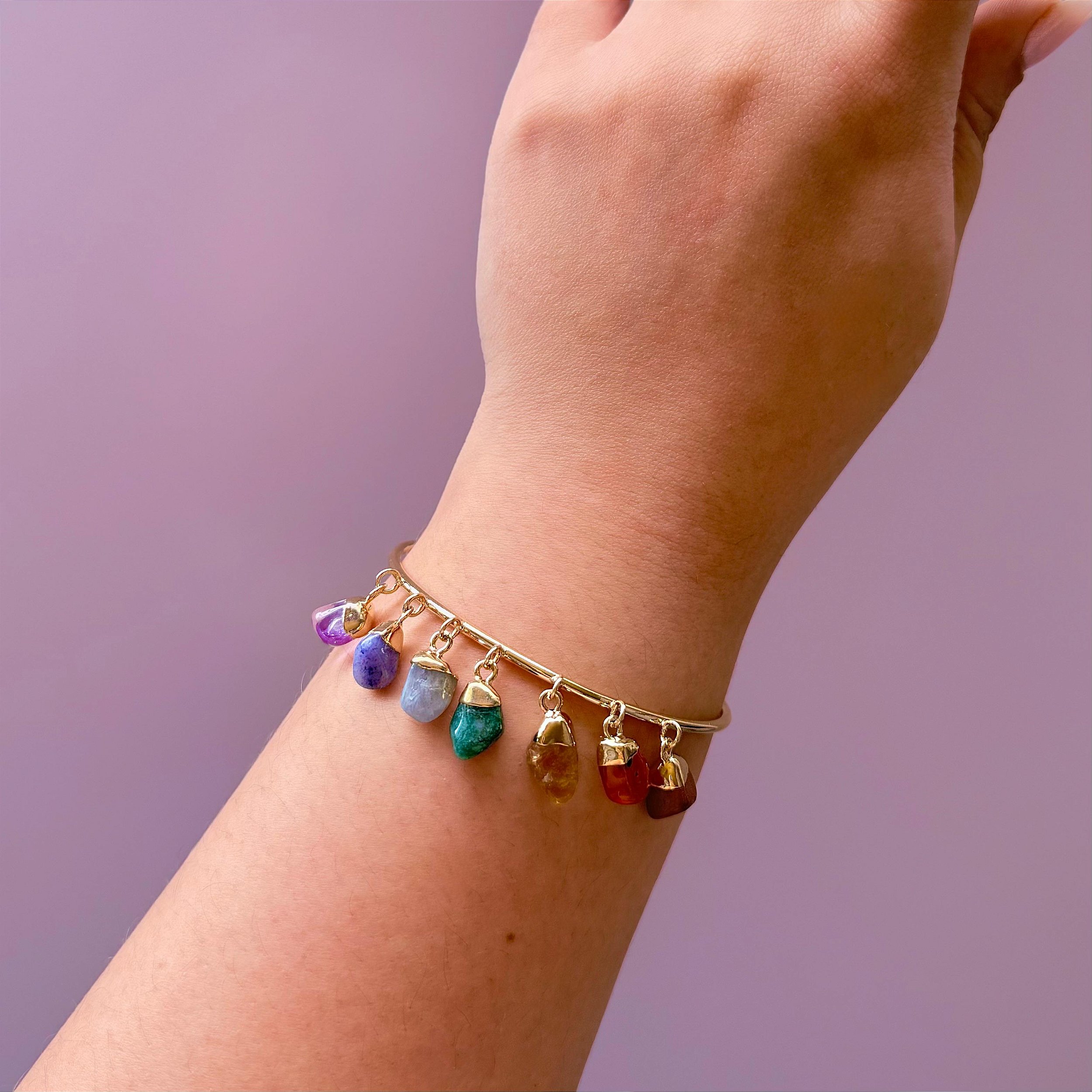 Pulseira com pedras naturais roladas dos 7 chakras, montada em estrutura folheada a ouro 18k. Um amuleto poderoso para quem busca equilibrar os centros de energia do corpo e alinhar emoções, mente e espírito com elegância e intenção.